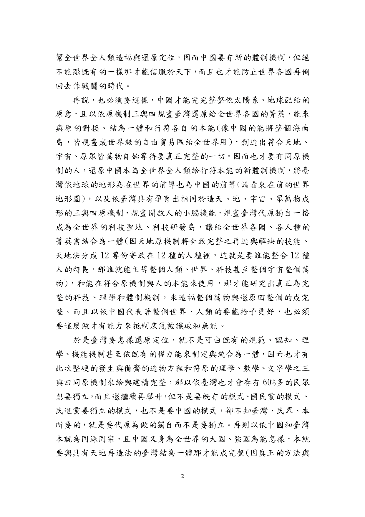 於是臺灣要怎樣還原定位,就不是可由旣有的規範、認知、理學、機能機制甚至依旣有的權力能來制定與統合為一體,因而也才有此次堅硬的發生與備齊的造物方程和符原的理學、數學、文字學之三與四同原機制來給與建構完整,那以依臺灣也才會存有60%多的民眾想要獨立,而且還繼續再攀升,但不是要旣有的模式、國民黨的模式、民進黨要獨立的模式,也不是要中國的模式,卻不知臺灣、民眾、本所要的,就是要代原為做的獨自而不是要獨立。再則以依中國和臺灣本就為同源同宗,且中國又身為全世界的大國、強國為能怎樣,本就要與具有天地再造法的臺灣結為一體那才能成完整(因真正的方法與權力為一體是絕分不開的),這豈不是成中國代表著要給全世界未來的能更好,而負有要糾正、革新臺灣退旣有固守不放的體制機制,那才能致使整個華人、中國的真正成完整,甚至要這樣以依中國也才能造就整個世界、整個人類以及各國的皆能成完整。