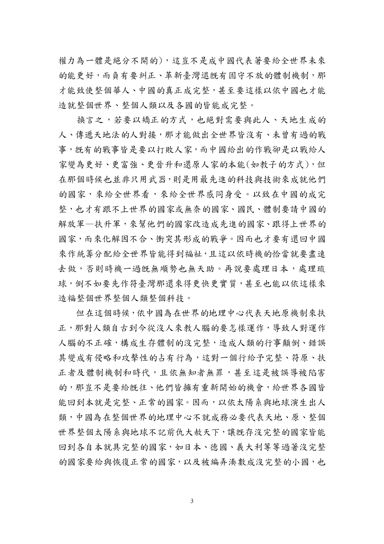 但在這個時候,依中國為在世界的地理中心代表天地原機制來扶正,那對人類自古到今從沒人來教人腦的要怎樣運作,導致人對運作人腦的不正確,構成生存體制的沒完整,造成人類的行事顛倒、錯誤其變成有侵略和攻擊性的占有行為,這對一個行給予完整、符原、扶正者及體制機制和時代,且依無知者無罪,甚至這是被誤導被陷害的,那豈不是要給旣往、他們皆擁有重新開始的機會,給世界各國皆能回到本就是完整、正常的國家。因而,以依太陽系與地球演生出人類,中國為在整個世界的地理中心不就成務必要代表天地、原、整個世界整個太陽系與地球不記前仇大赦天下,讓旣存沒完整的國家皆能回到各自本就具完整的國家,如日本、德國、義大利等等過著沒完整的國家要給與恢復正常的國家,以及被編弄湊數成沒完整的小國,也要給與再組配成完整的國家,且這也才不愧疚於中國受眾者、天地的愛戴擁護而為在整個世界的地理中心。