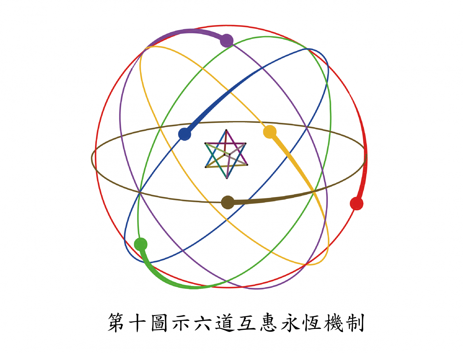 前一段敘文四本質的重構:很好,因而才有六為最穩定的運做軌道,也是電子的運行軌道,如第十圖示六道互惠永恆機制。